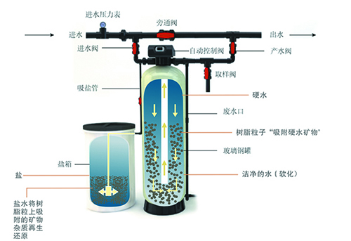 由于水的硬度主要由钙、镁形成及表示,故一般采用阳离子交换树脂(软水器),将水中的Ca2+、Mg2+(形成水垢的主要成份)置换出来,随着树脂内Ca2+、Mg2+的增加,树脂去除Ca2+、Mg2+的效能逐渐降低。